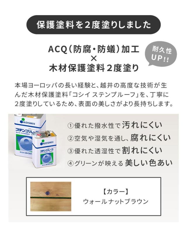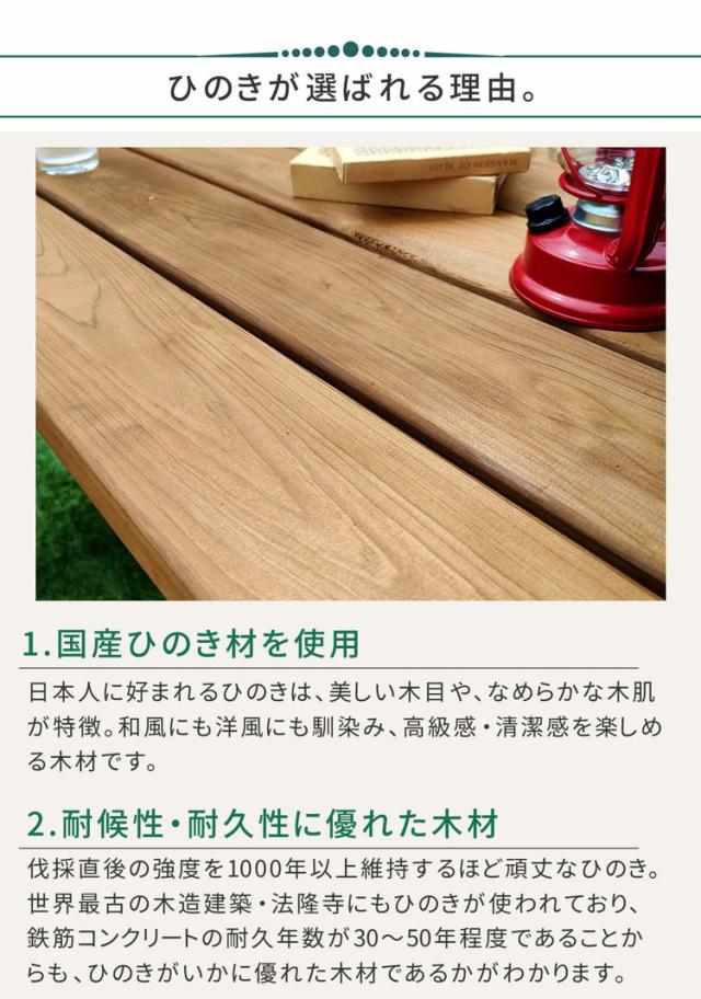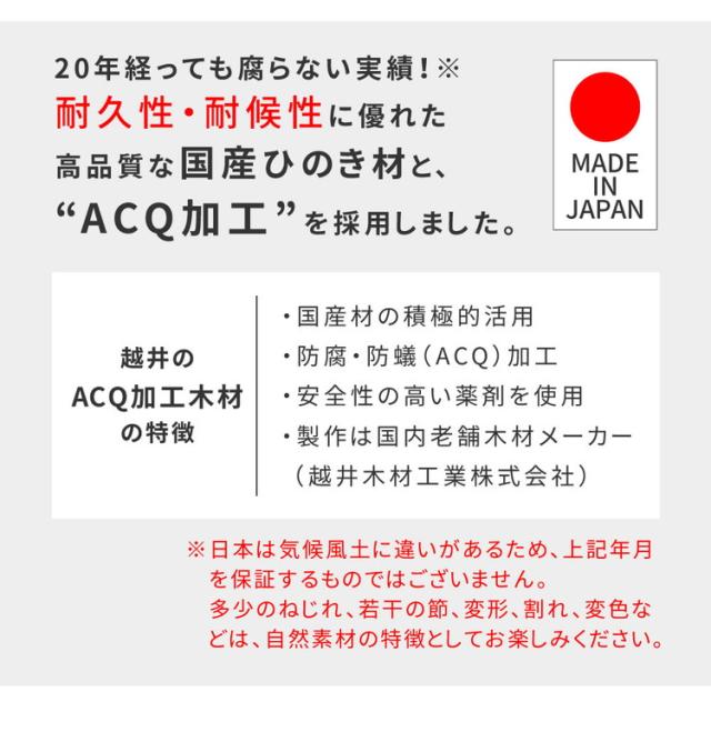 高品質な国産ひのき材をたっぷりと使用し、国内工場生産で安心安全。防腐・防蟻(ACQ)加工で耐久性も抜群です。