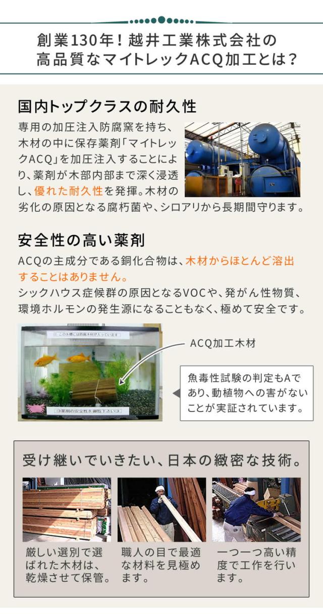 耐久性・耐候性に優れた高品質な国産ひのき材と、“ACQ加工”を採用しました。