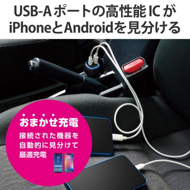 ■USB-Aポートに搭載した高性能ICがiPhoneとAndroid端末を自動で見分けて、最適な出力で充電できる“おまかせ充電”に対応しています。