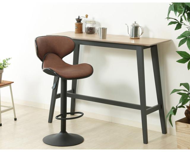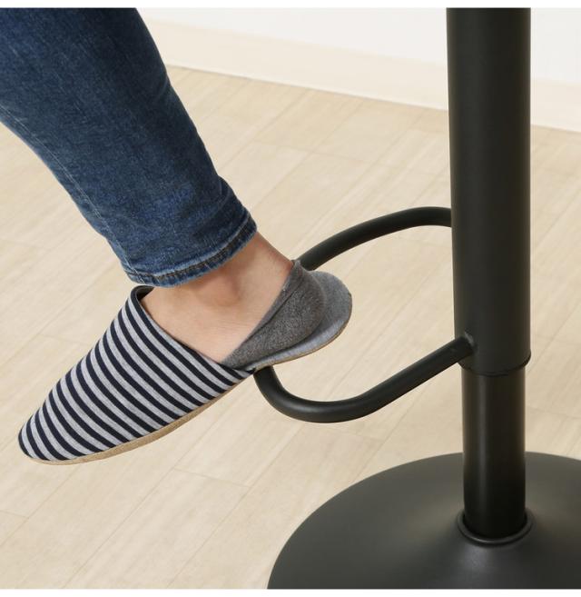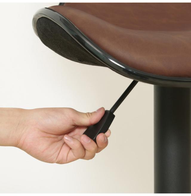 レバーで座面の高さを調節できます。61〜82cmで調節でき、身長やカウンターの高さに合わせて快適に使用できます。長時間座っても疲れにくい便利なフットレス付きです。また座面は360度回転するので、スムーズに立ち座りできます。クロム加工を施したブラックフレームとやや艶のある合成皮革を使用した高級感あふれる商品です。
