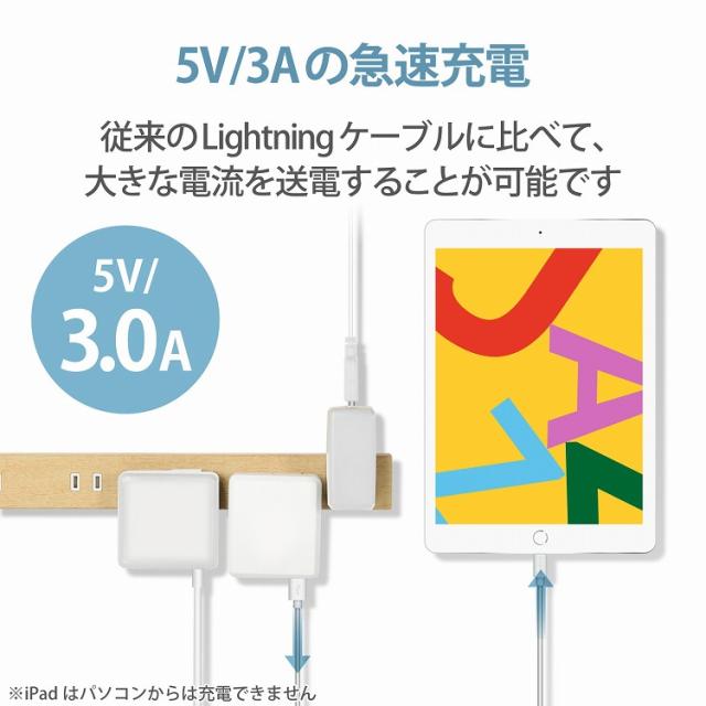 ■USB(Aタイプ)のインターフェイスを持つパソコンに、Lightningコネクタを持つiPhoneやiPod、iPadを接続し、充電やデータ通信ができるUSBケーブルです。※iPadはパソコンからは充電できません。