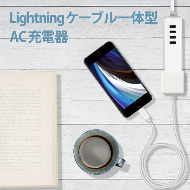 家庭用コンセントからLightningコネクタ搭載のiPhoneやiPad、iPodを充電できるLightningケーブル一体型のAC充電器です。ケーブルの長さは1mです。