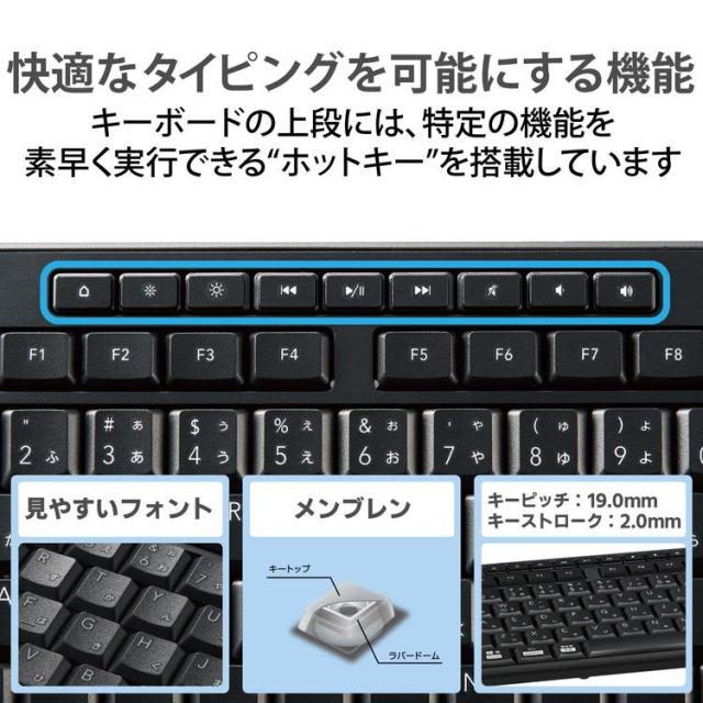 ■キーボードの上段には、特定の機能を素早く実行できる“ホットキー”を搭載しています。専用キーを押すだけでメディアプレーヤーの起動、音量や明るさの調整など、9種類の操作が可能です。