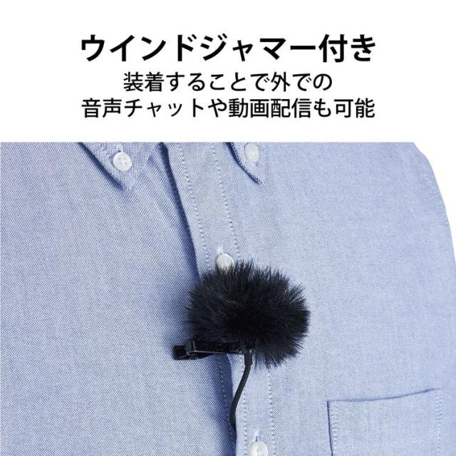 動画撮影に最適な衣服などに装着できるクリップ付きピンマイク。イヤホンを同時に接続できる変換ケーブルや風切り音や息によるノイズを低減できるウインドジャマー、ウインドスクリーン付き。