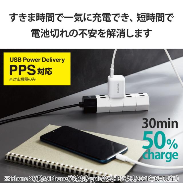 USB Type-C(TM)ポートを1ポート搭載し、GaN(窒化ガリウム)を採用した小型で軽量、かつ高出力なUSB AC充電器です。USB Power Deliveryに対応し対応するノートパソコンやスマートフォン、タブレットなどを超高速充電が可能です。本製品のUSB Power Delivery最大出力は45Wです。PPSに対応する機器の場合には端末に最適な出力で効率的に電源を供給できます。