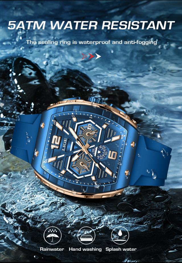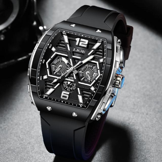 Lige-メンズ防水クォーツミリタリーウォッチ、シリコンスクエアクロノグラフ、高級ファッション時計、トップブランド