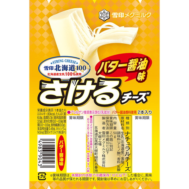 商品名 [冷蔵]雪印北海道100 さけるチーズ(バター醤油) 50g×3個 容量 50g×3個 原材料名 生乳(北海道産)、食塩/調味料(アミノ酸)、香料、乳酸 アレルギー特定原材料 乳 賞味期限 商品の発送時点で、30日以上あるものをお届けいたします 保存方法 要冷蔵10℃以下