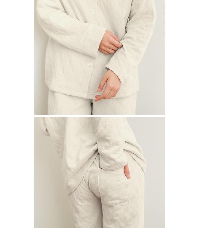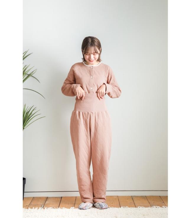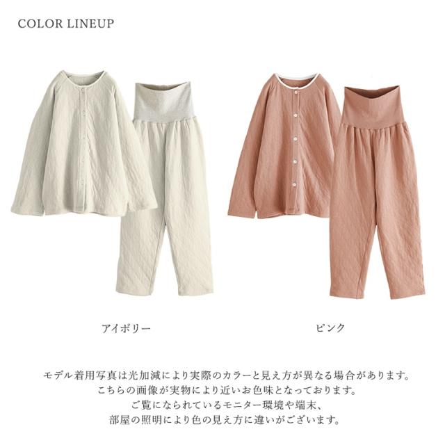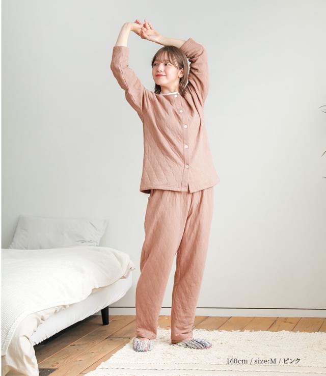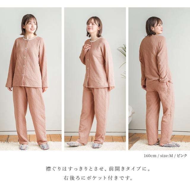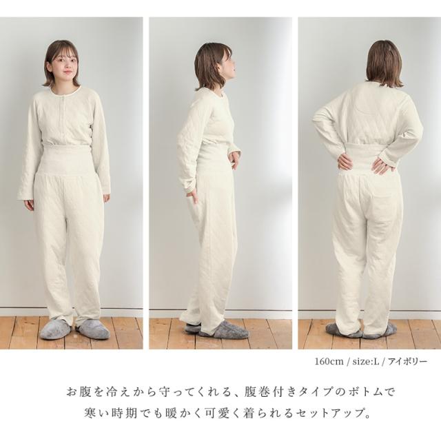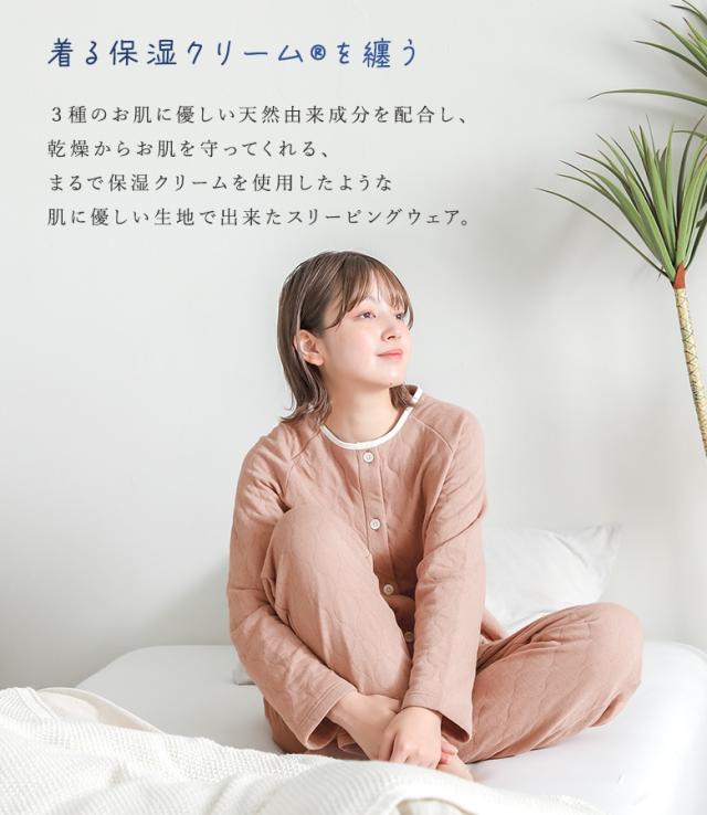 パジャマ レディース ルームウェア キルト ソフトキルト あったか 暖かい 長袖 秋冬 無地 ナイトウェア 上下セット セットアップ 部屋着 着る保湿クリーム キルティング おしゃれ かわいい ギフト 腹巻 ロングパンツ 柔らか 保湿 M L LL 乾燥肌 敏感肌 肌にやさしい スキンケア 肌ケア 乾燥対策 シアバター オリーブオイル シルクアミノ酸 ラグラン ボタン シンプル 襟なし 寝巻き 寝間着 リンクコーデ お揃い 2点セット トップス 天然由来成分配合 水分率高い 水分含有 乾燥防止 乾燥から守る 保湿ケア ボディケア ファッション雑貨 温活 寒さ対策 冷え対策 腹巻き 一体型 腹巻一体型 リブ フィット感 ロング丈 ポケット おうちで洗える 秋 大人女子 大人可愛い お洒落可愛い ナチュラル Mサイズ Lサイズ LLサイズ 入院 アイボリー ベージュ ピンク サーモンピンク くすみピンク くすみカラー スモーキーカラー 母の日 【TP】 ライフスタイル雑貨 プレゼント 贈り物 お祝い 生活雑貨 引っ越し祝い 在宅 おうち時間 寝室 ベッドルーム kiruhoshitsu[ID]24gm091[ノーカラーラグランスリーピングウェア]