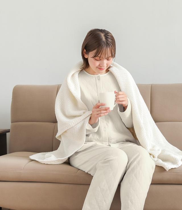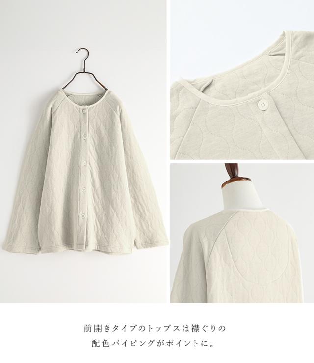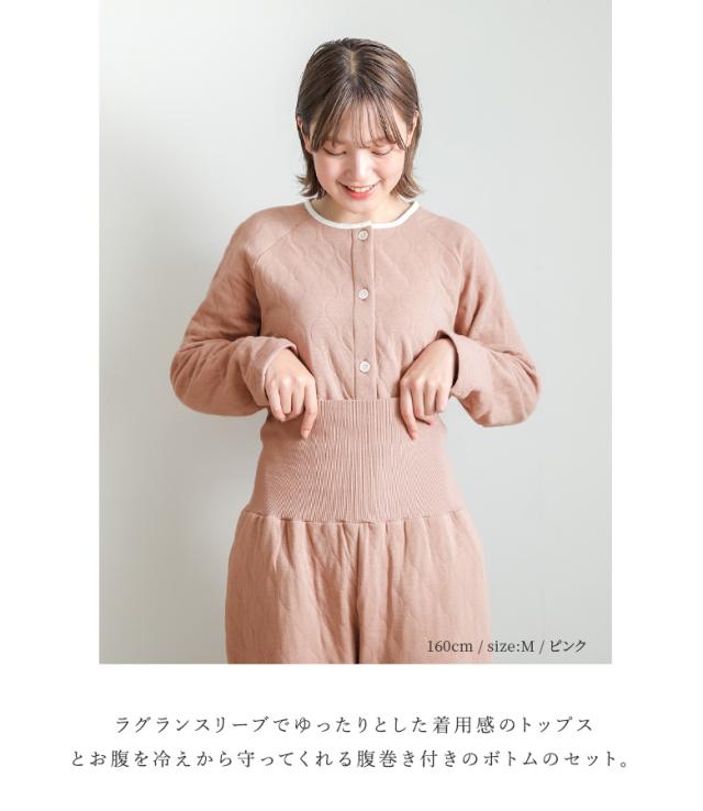 『ノーカラーラグランスリーピングウェア』【メール便不可】【30】[パジャマ レディース ルームウェア 腹巻 キルト ソフトキルト あったか 暖かい 長袖 秋冬 無地 ナイトウェア 上下セット セットアップ 部屋着 着る保湿クリーム キルティング おしゃれ かわいい ギフト]