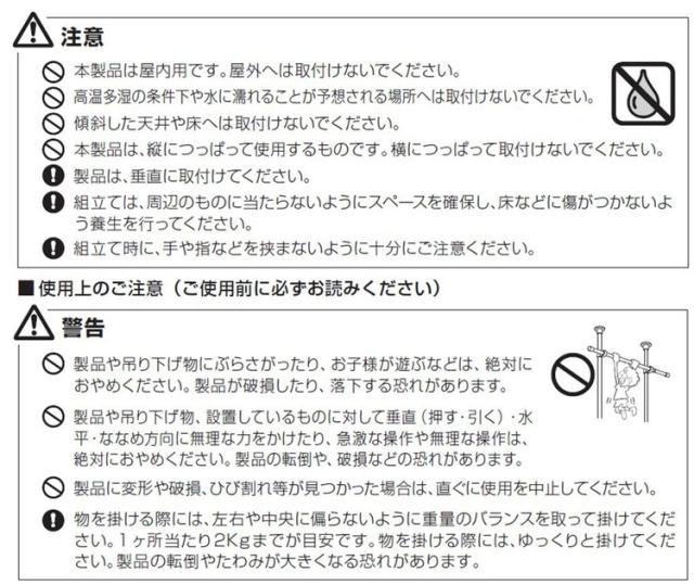 設置後は、安全にご使用いただくために、許容荷重以上のものを吊るさないようご注意ください。※サイズに応じ許容荷重が異なります。