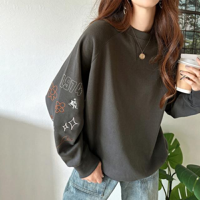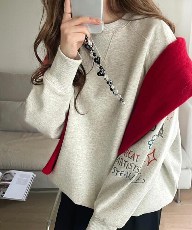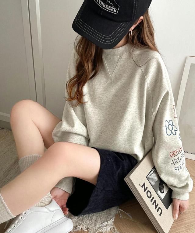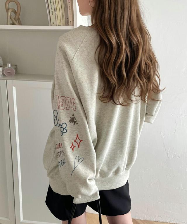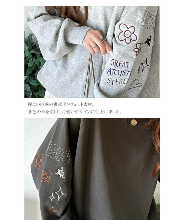 片袖にハンドメイド風の刺繍を多種施した裏起毛スウェット。