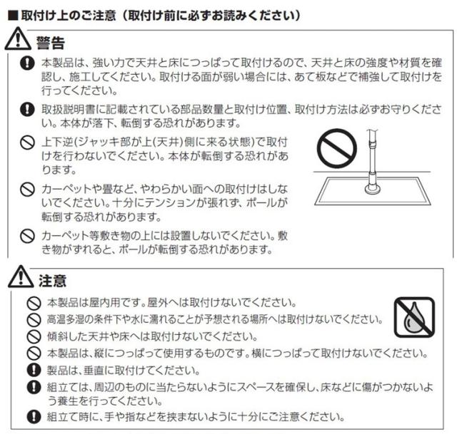 つっぱり棒を設置する際は、必ず取扱説明書をよく読んでから設置してください。
