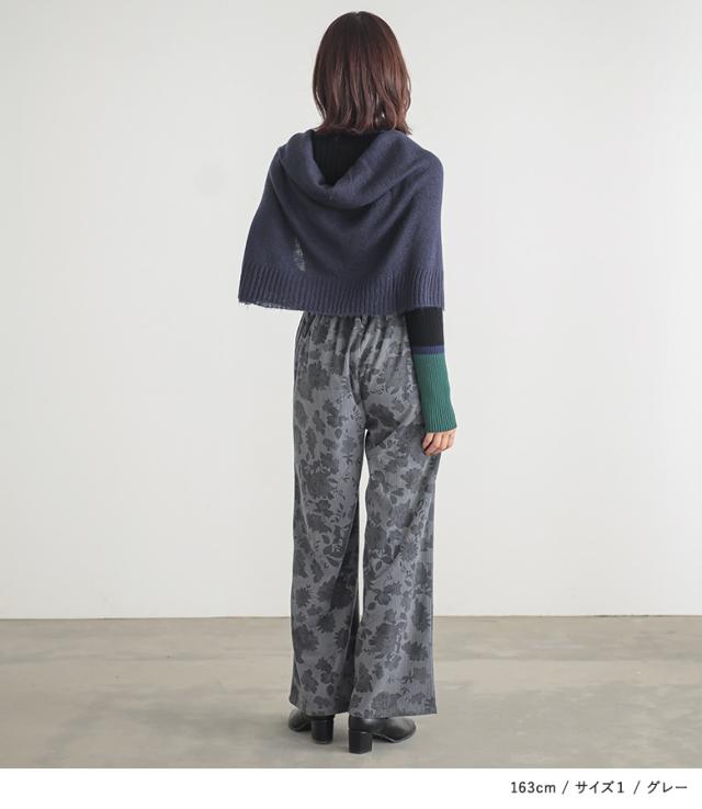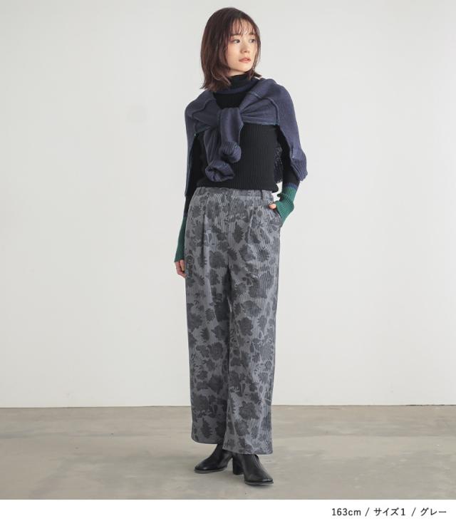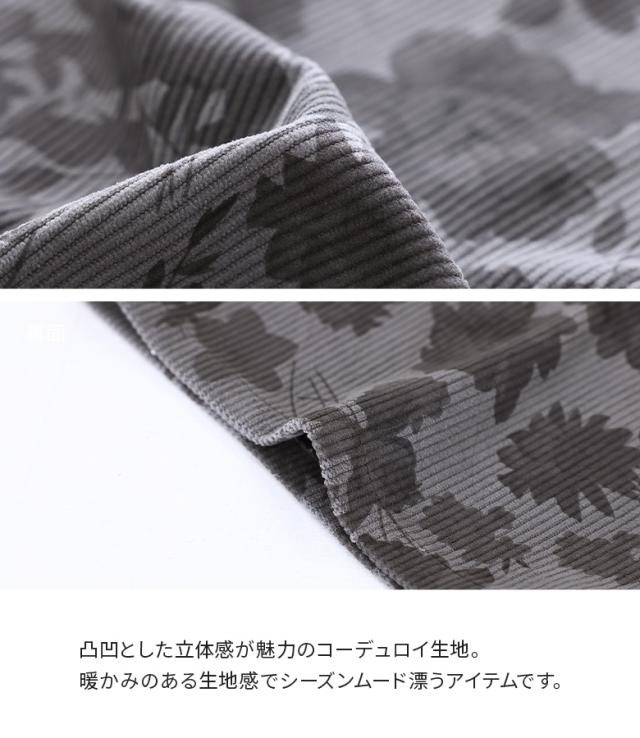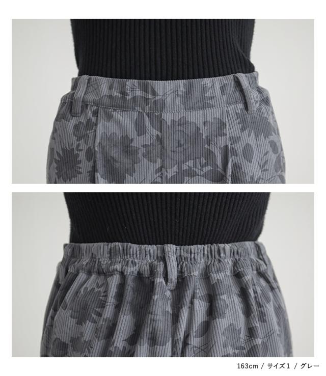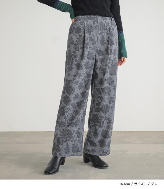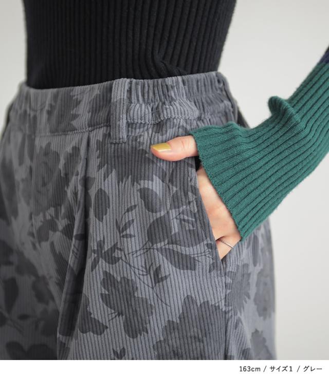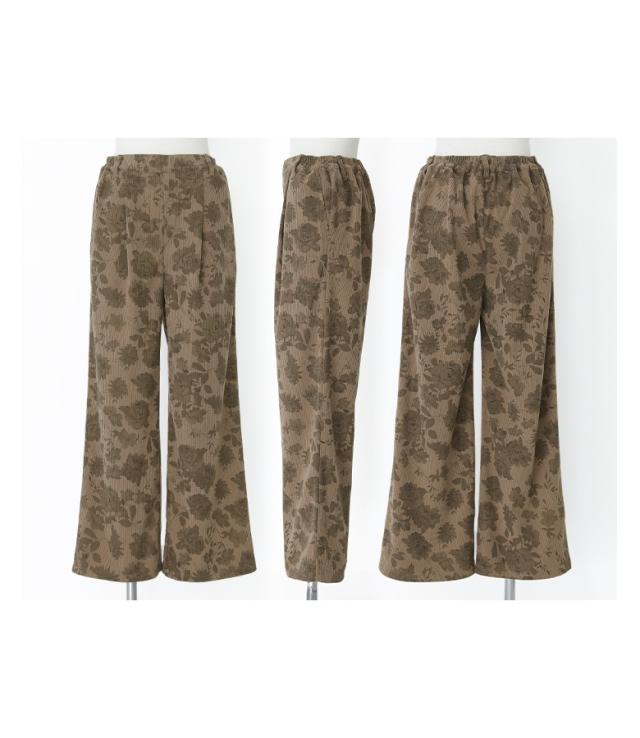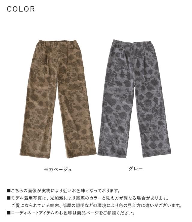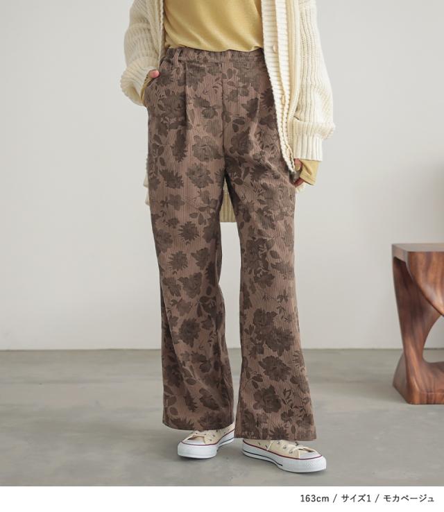 『フラワーパターンコーデュロイパンツ』【メール便不可】【20】[ワイドパンツ レディース ボトムス コーデュロイパンツ 柄パンツ 花柄 ストレート ポケット ウエストゴム ロングパンツ 秋 冬]