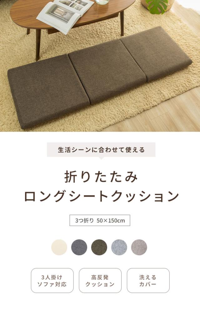 ソファ対応、折りたたみ、ロングシートクッションマット、50×150cm、7cm厚、2WAY、長座布団、クッション、折りたたみ3連タイプ、洗えるカバー、無地、おしゃれ