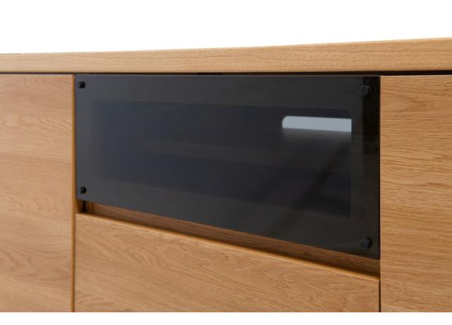フラップ式扉はスモークガラスが前面に張られ、マットな美しい木目の本体にガラスの鏡面感が際立ちます。