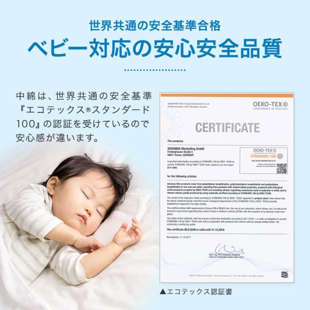 世界共通の安全基準エコテックス(R)スタンダード100の認証を受けた、安心の中綿です。