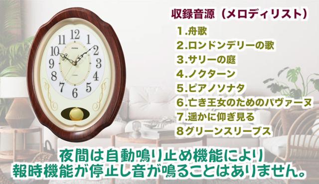 機能: 電波時計、ステップ秒針、夜間秒針停止機能、報時機能(8曲メロディ)、音量無段階調節、振子