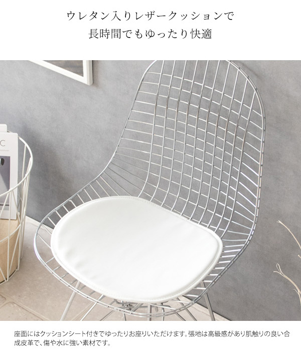 スチールのワイヤーが網目状に構成された背もたれは軽量かつ耐久性に優れており、ウレタンの入ったレザーの座面でお尻が痛くなりにくいデザインです。