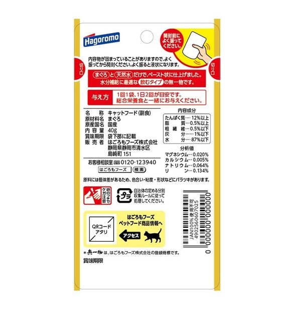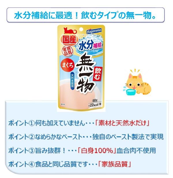 まぐろと天然水だけでペースト状に仕上げました。水分補給に便利な「飲む」タイプの無一物。添加物を一切使用していない国産・無添加のキャットフードです。食品に使用する原料と同じ原料を使用した家族品質のキャットフードです。