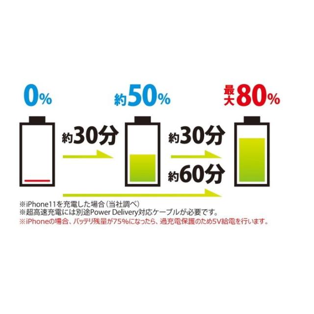 最大20V/1.5A(30W)までの給電が可能で充電時間を短縮、iPhone 11では充電時間30分で約50%まで充電することができます。