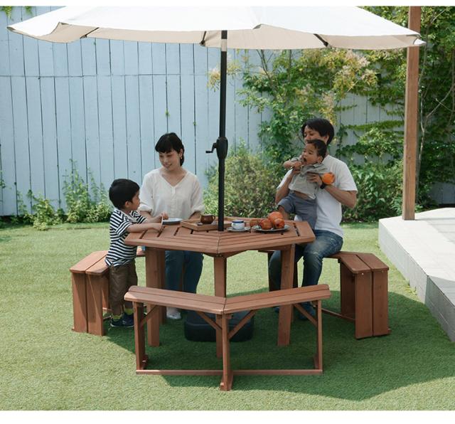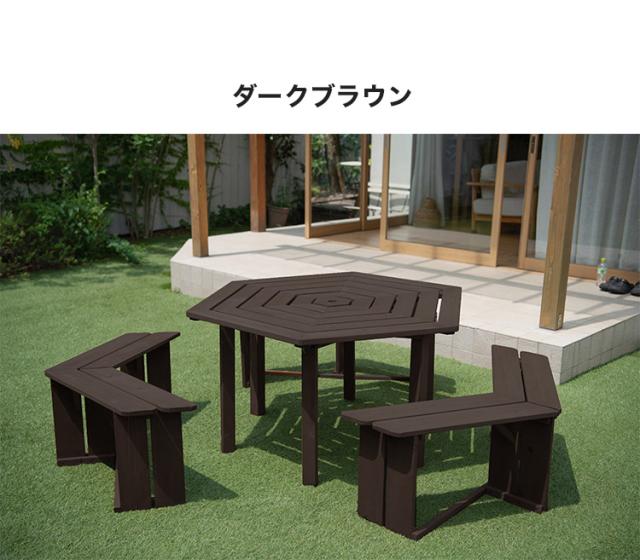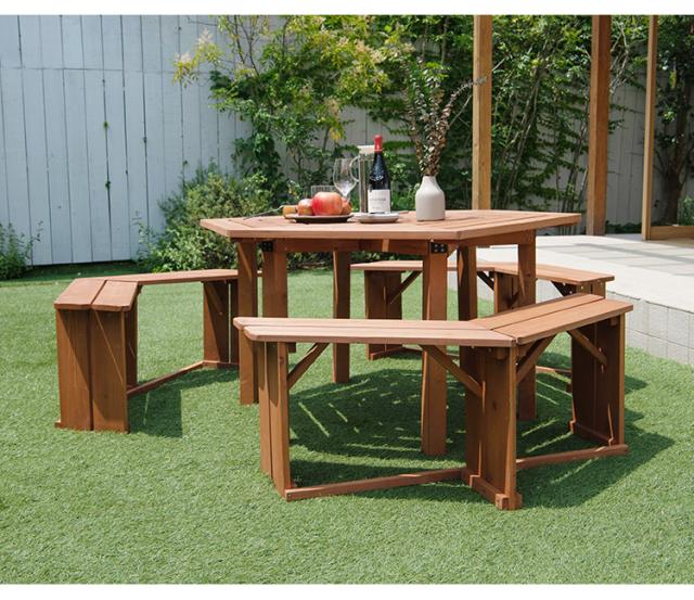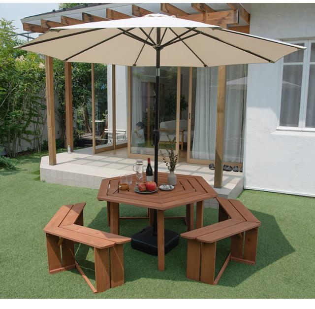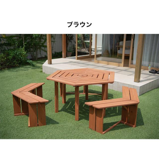 ガーデン テーブルベンチセット 木製 六角 ブラウン 最大6人使用可能 ガーデンテーブル ガーデンベンチ ガーデンテーブル&ベンチ4点セット 天然木 BBQ ガーデニング(代引不可)【送料無料】