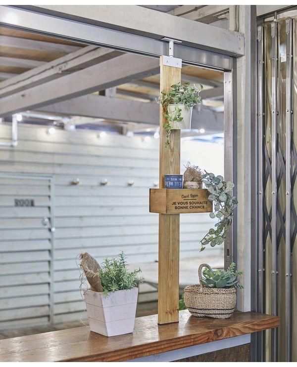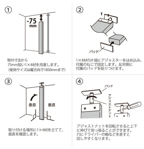 【使用荷重について】柱に対し片側に荷重がかかる場合は10kgまでとしてください。倒れる恐れがあります。(棚板を使用する場合は棚板の重さも含みます。)使用荷重は実験値です。設置場所や、使用木材によって条件が変わる為、保証するものではありません。転倒することもありますので、自転車、テレビ、貴重品はかけないでください。【設置前のご注意】・この商品は屋内・屋外用です。市販の1×4材(19×89mm)に装着し、使用します。・取付寸法から75mm短い1×4材をご用意ください。・使用する1×4材に反りや曲がりがあると正常に装着や設置ができない場合があります。・アジャスター本体にはサビにくい塗装をしていますが完全にサビの発生を防ぐものではありません。・万一に備え、落下や転倒の可能性のある2階以上のベランダなどには設置しないでください。・雨や水滴、水蒸気の直接あたる場所には使用しないでください。・下地のしっかりした場所に設置してください。下地の弱い所に設置すると転倒の原因となったり、天井を破損したりする恐れがあります。・傾斜した天井、床面には設置しないでください。また床と垂直に設置してください。・縦突っ張り専用です。横向きには使用しないでください。