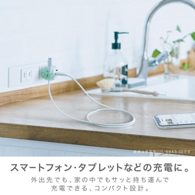 外出先でも、家の中でも、サッと持ち運んで充電できる!コンパクト設計。やわらかシリコン素材のケーブルリングは、ケーブルを束ねたり、使い方いろいろ!本体バンドとケーブルリングを合わせて使えば、充電器本体とケーブルをすっきりまとめて持ち運ぶことができます。2台同時に充電ができる、2つのUSBポート(USBType-A/USBType-C)が付いています。USBPD(USBPowerDelivery)対応。最大出力2Wの給電能力で、急速充電が可能(Type-Cのみ)スマートIC機能で、接続機器を自動的に検知し、最適な電流で充電を行います。プラグは折りたたみ式なので、持ち運びの時にじゃまになりません。日常にマッチする3色のカラー展開で、お好みのものをお選びいただけます。