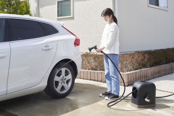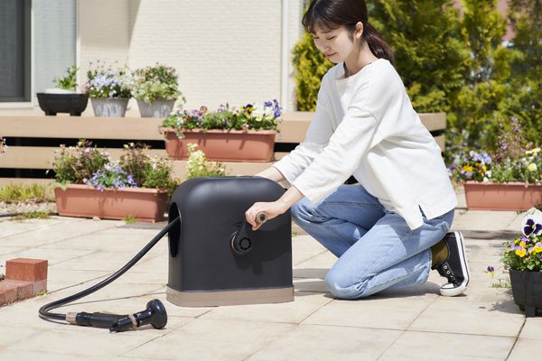 アーチ状の巻取り口でスムーズに巻取りが出来るフルカバーホースリールです。「耐圧糸入り」「防藻インナー」「ノッチ加工」のホースなので、ねじりにくく、つぶれにくいです。ワイドアクアガン付きで、通常量の1.5倍散水が可能です。ワンタッチプッシュコネクターなので、簡単に接続できます。
