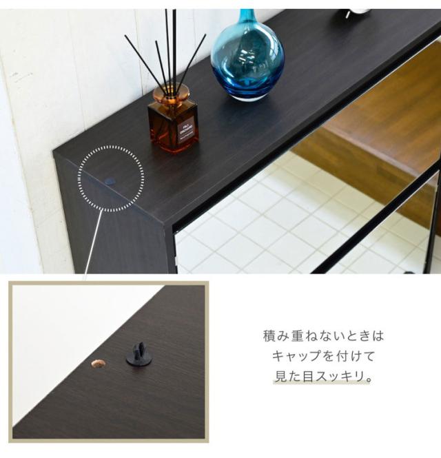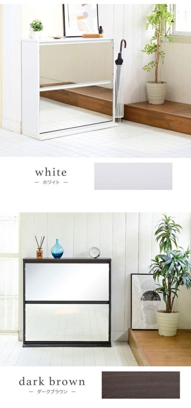 玄関の限られたスペースにも設置しやすい薄型のシューズラック。扉にはミラーを付けているので、お出かけ前の足元チェックにも活躍します。前に開くフラップ扉式で、コーナーに置いても扉が干渉しないデザインです。