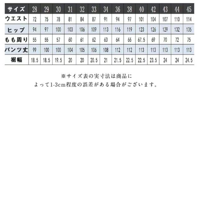 | サイズについての説明 | ウエスト ヒップ もも周り パンツ丈 裾幅 ※サイズ表の実寸法は商品によって1-3cm程度の誤差がある場合がございます。 |