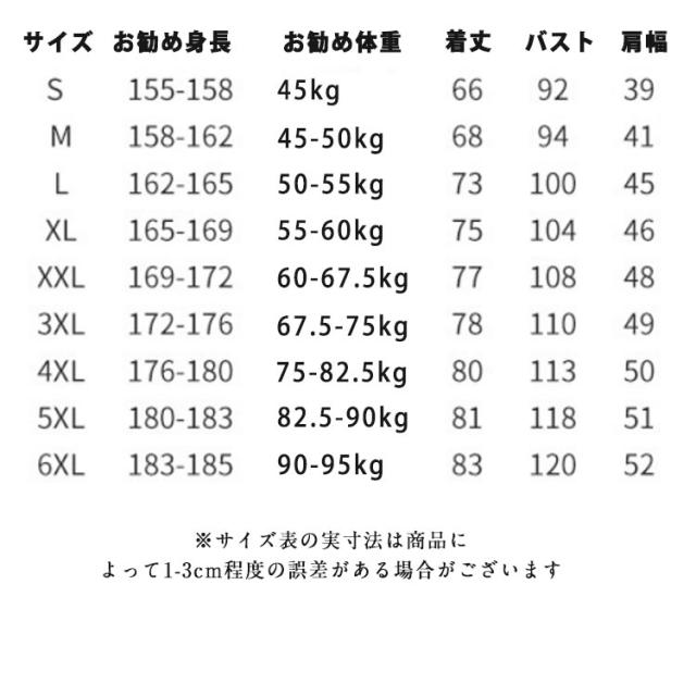 | サイズについての説明 | サイズ お勧め身長 お勧め体重 着丈 バスト 肩幅 ※サイズ表の実寸法は商品によって1-3cm程度の誤差がある場合がございます |