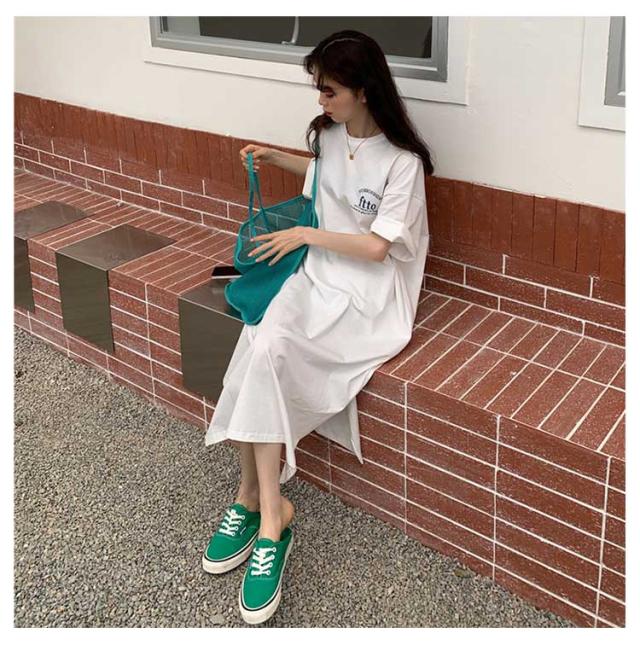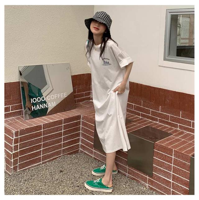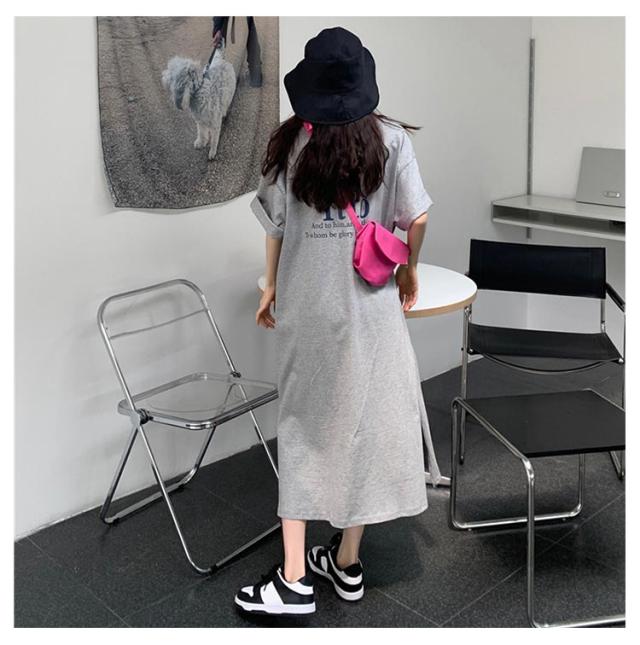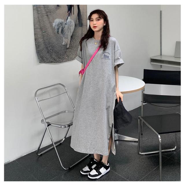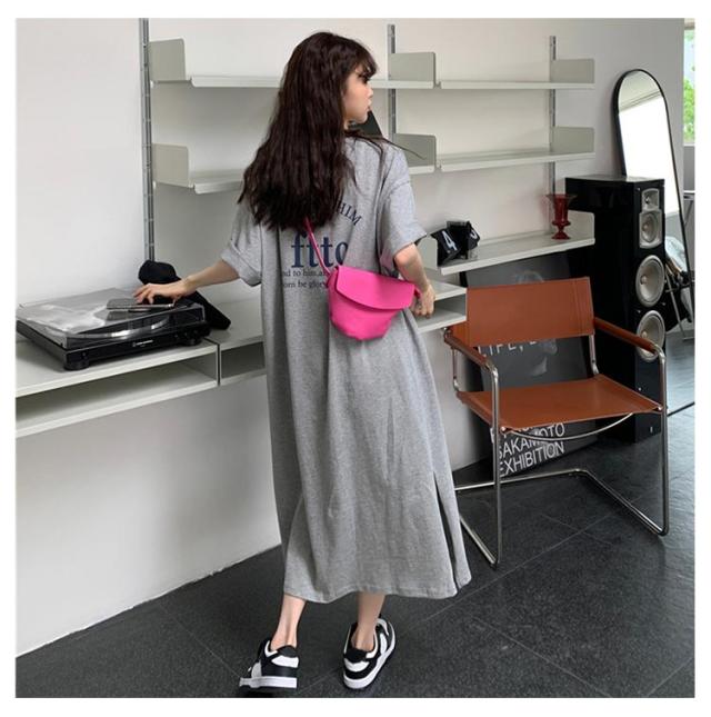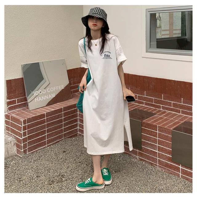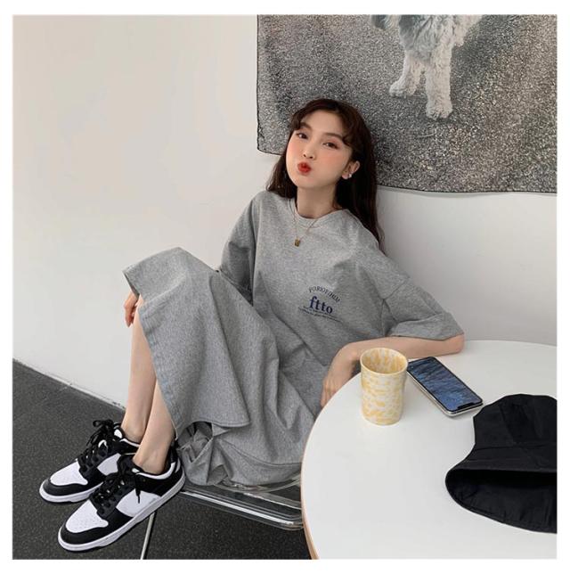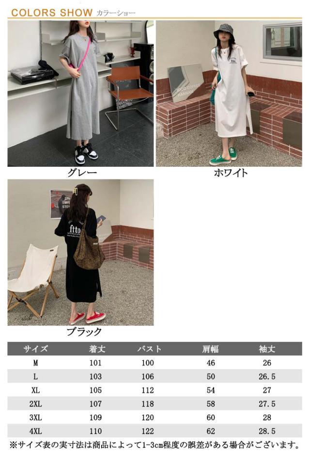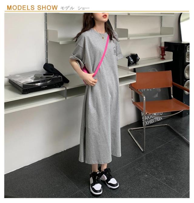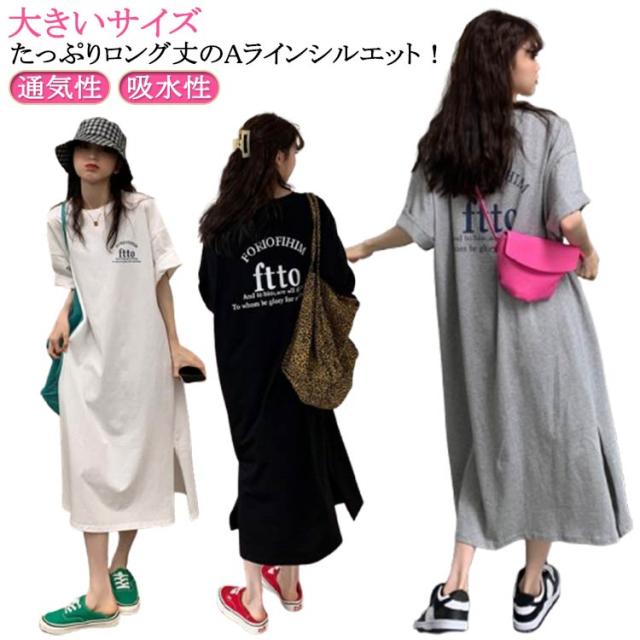 春 部屋着 夏 Tシャツ かわいい プルオーバー 体型カバー レディース ゆるワンピ 半袖 サイドスリット ロング丈 ロングワンピ ルームウェア リラックスワンピース 大人カジュアル 大きいサイズ 半袖 ゆったり 大きめ プリント 英字ロゴ 楽ちん