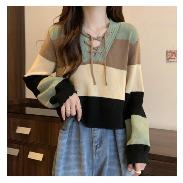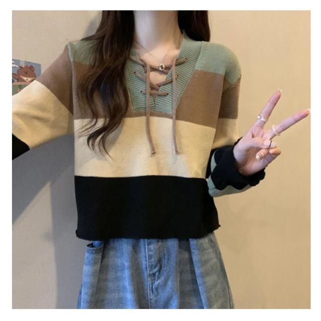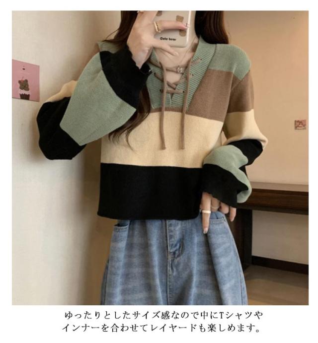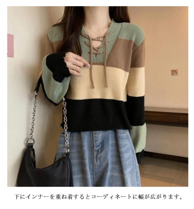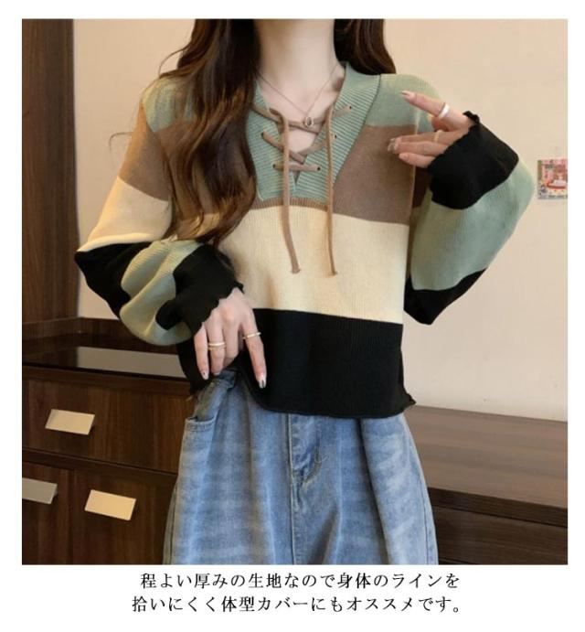 Vネック ニット ニット スキッパー セーター スキッパーニット プルオーバー レディース セーター ニット ニットトップス ニットプルオーバー ボーダーニット リボン セーター トップス 大人 かわいい レディース