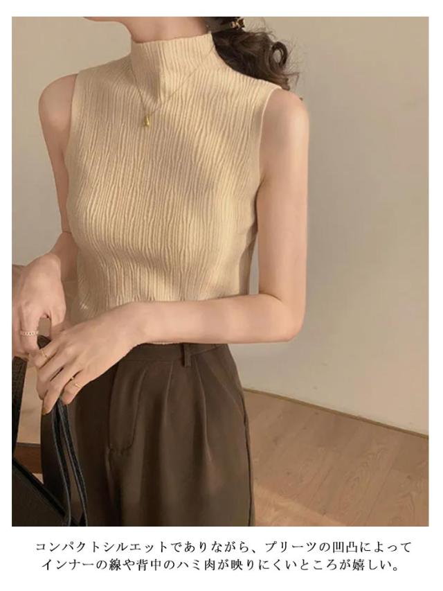 | 大人っぽさを演出してくれるハイネックノースリーブトップス。 ノースリーブのデザインは上着やカーディガンを羽織った際に袖がもたつかず、レイヤードスタイルに最適。 コンパクトシルエットでありながら、プリーツの凹凸によってインナーの線や背中のハミ肉が映りにくいところが嬉しい。 INしてもしなくても、ボトムス選ばず合わせやすい丈感。 ふんわり柔らかな肌触りと抜群の伸縮性で楽な着心地を叶えます。 プリーツにより、カジュアルやエレガント、さまざまなシーンで活躍します。 コーディネートに取り入れるだけでも、上品な甘さのある着こなしに決まるアイテムです。 | |