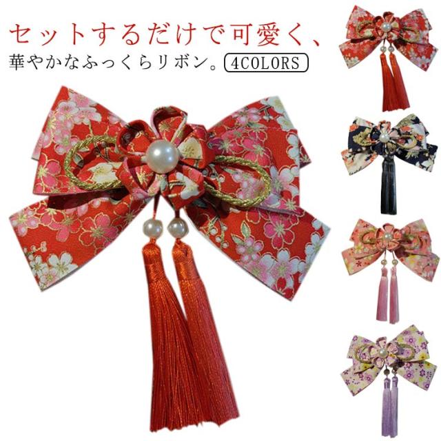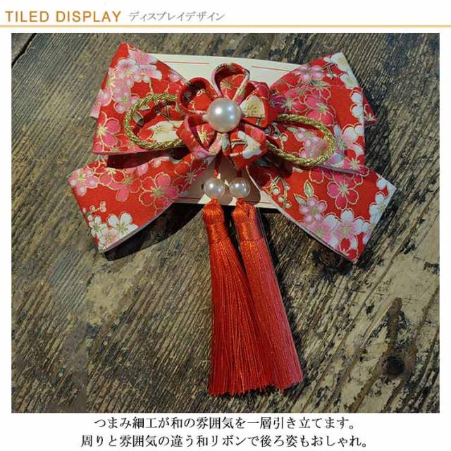 | セットするだけで可愛く、華やかなふっくらリボン。 つまみ細工が和の雰囲気を一層引き立てます。 周りと雰囲気の違う和リボンで後ろ姿もおしゃれ。 シンプルなポニーテールもこれセットすれば、七五三・成人式・袴の和装にぴったりな華やかなヘアスタイルに。 華やかなヘアアクセサリーで、晴れの日に特別な装いをお楽しみいただけるお品です。 華やかでレトロな可愛らしいリボンの髪飾り、タッセルが歩くたびに揺れて印象的です お顔の横や後ろなど付けるだけで可愛らしく上品な印象に。 | |
