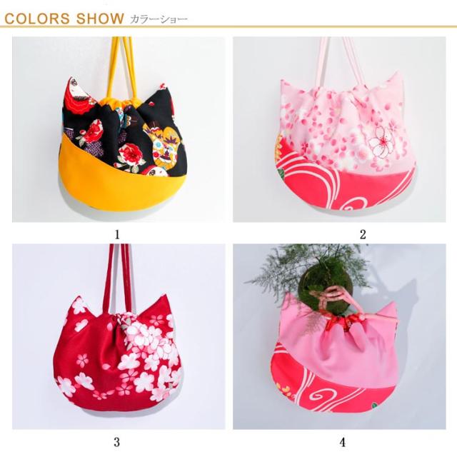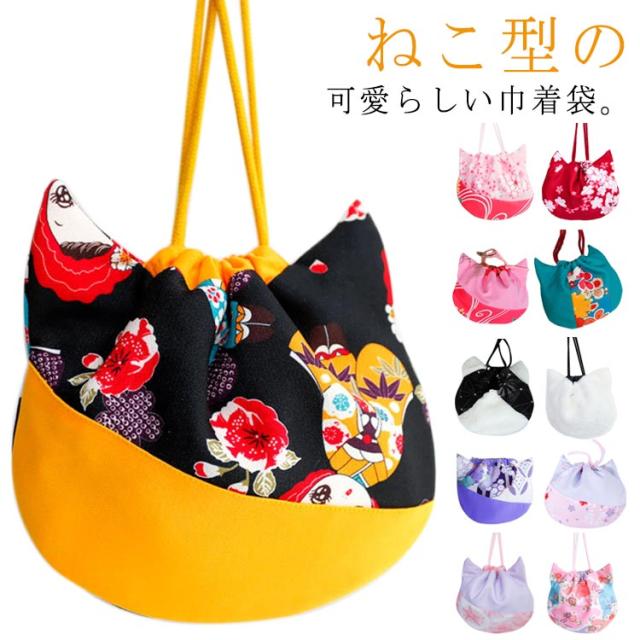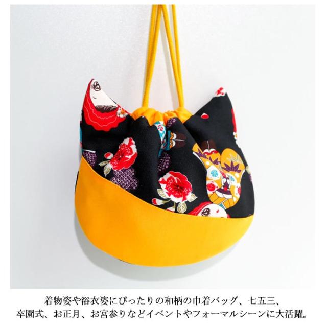 | ねこ型の可愛らしい巾着袋。 キュット紐を締めるだけで可愛いネコちゃんに変身。見ているだけで癒される。 着物姿や浴衣姿にぴったりの和柄の巾着バッグ、七五三、卒園式、お正月、お宮参りなどイベントやフォーマルシーンに大活躍。 | |