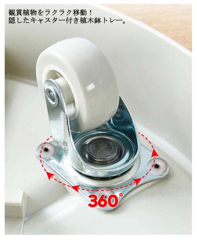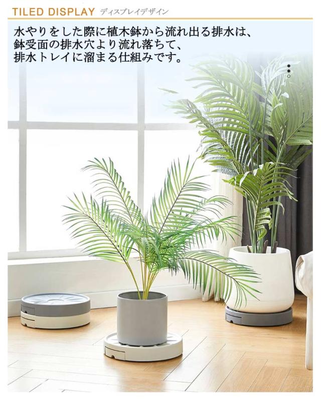 | 【360°回転隠したキャスター排水できる鉢受台】 水やりをした際に植木鉢から流れ出る排水は、 鉢受面の排水穴より流れ落ちて、排水トレイに溜まる仕組みです。 排水トレイを引き出せば、簡単に排水を取り出して捨てることができます。 鉢受皿のように排水が貯まらないので、植物の根腐れを軽減できます。 観賞植物をラクラク移動!隠したキャスター付き植木鉢トレー。 屋内のどんな空間にもフィットするので、 インテリアグリーンのレイアウトの幅を広げます。 | |