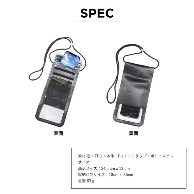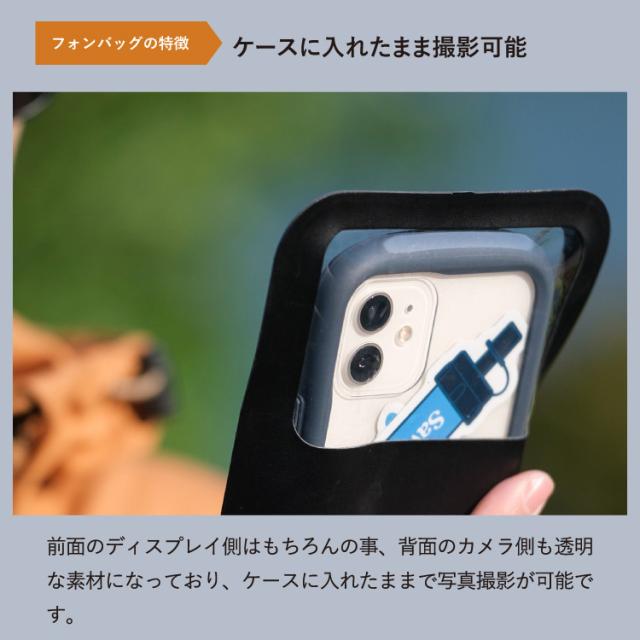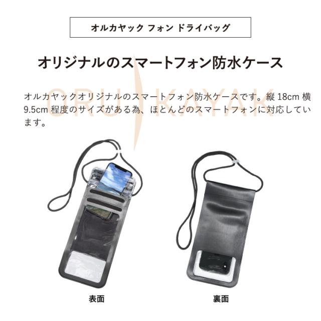 オルカヤックオリジナルのスマートフォン防水ケースです。縦18cm 横9.5cm 程度のサイズがある為、ほとんどのスマートフォンに対応しています。前面のディスプレイ側はもちろんの事、背面のカメラ側も透明な素材になっており、ケースに入れたままで写真撮影が可能です。
