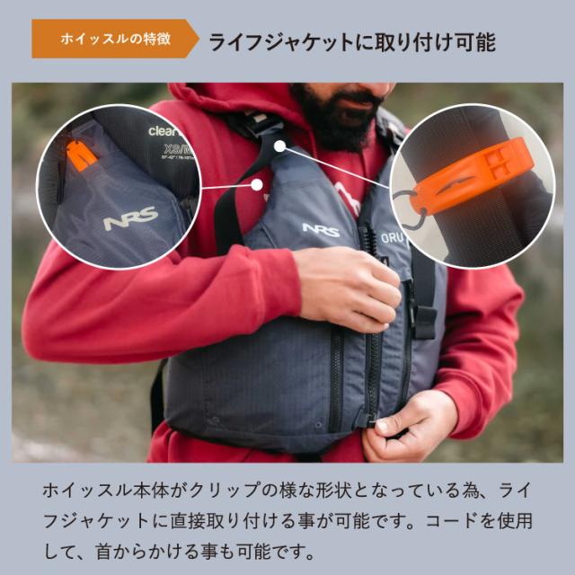 ホイッスル本体がクリップの様な形状となっている為、ライフジャケットに直接取り付ける事が可能です。もちろん付属のコードを使用して、首からかける事も可能です。