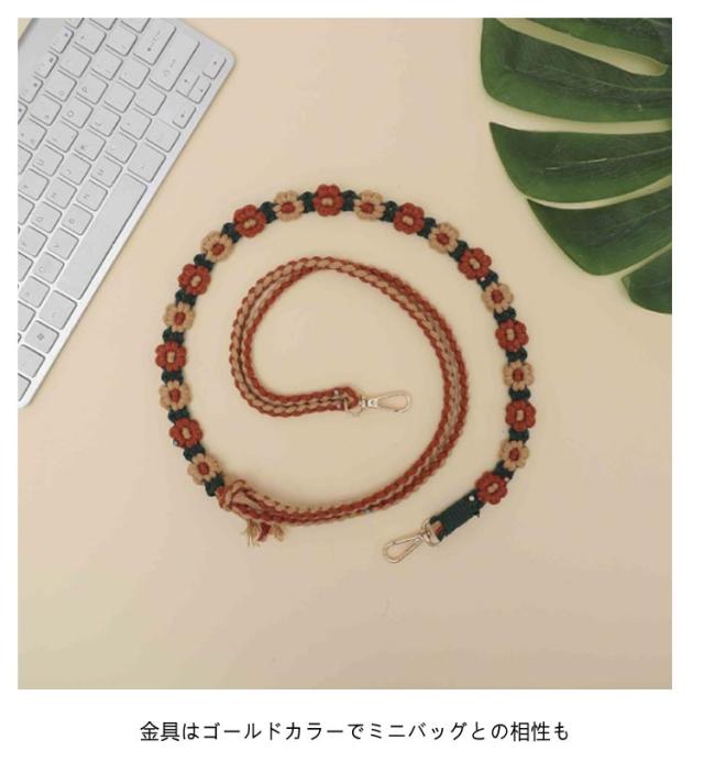 | 調整可能!お花のワンポイントが可愛いモバイルストラップ。 雰囲気のある色あいで、お気に入りのコーデに合わせてカラーが選べます。 どのような様々な携帯ケースにも付けやすいカラビナタイプ。 金具はゴールドカラーでミニバッグとの相性も◎ 1本、1本丁寧な手事なので、とっても丈夫な作りです。 太めのマクラメ編みなので肩への負担もかかりにくいデザイン。 バックスタイルも華やかになります。 自分用にもプレゼントとしても喜ばれるアイテムです♪ | |