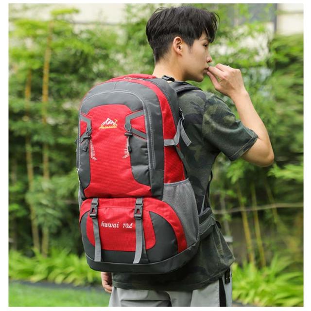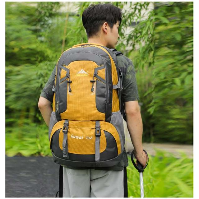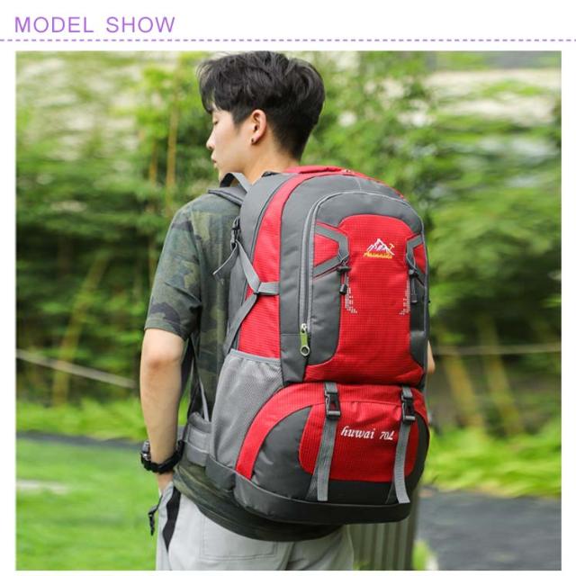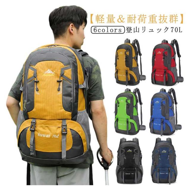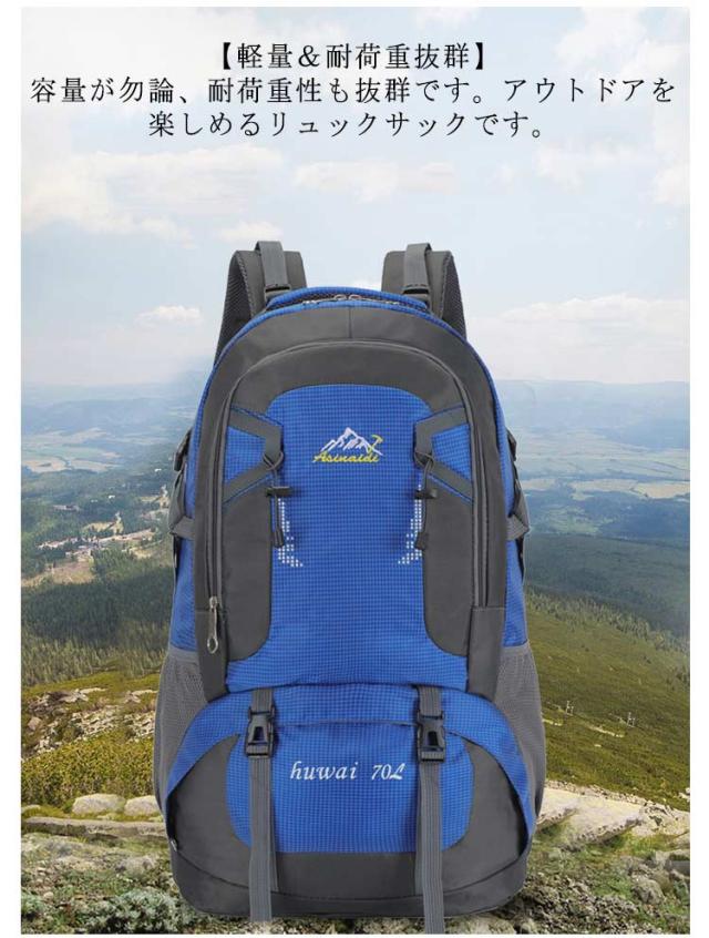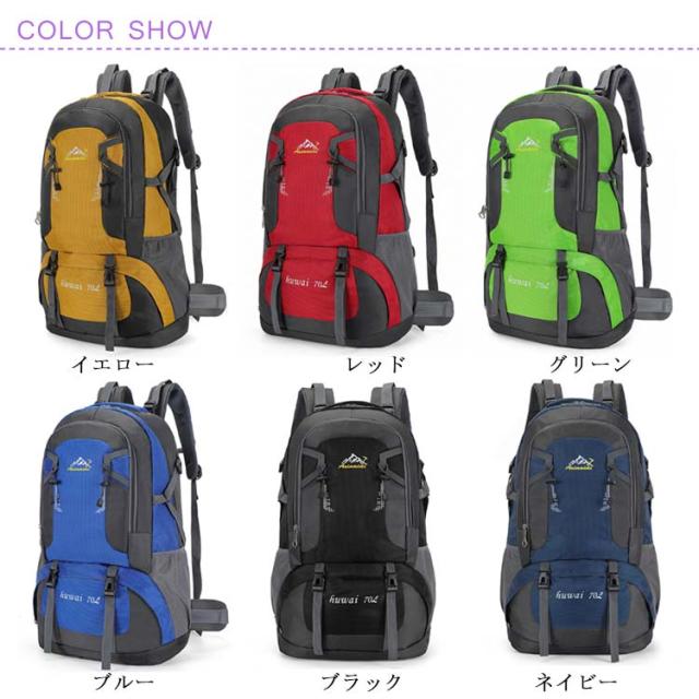| 登山リュック70L 【軽量&耐荷重抜群】容量が勿論、耐荷重性も抜群です。アウトドアを楽しめるリュックサックです。 【素材】引き裂き防止と撥水のあるナイロン素材を採用するので、雨でも安心使用できます。引き裂き防止機能があって、野外でもリュックが擦りむけられることが心配無用です。リュックが長持ちできます。 【デザイン】調節可能な胸帯、ストラップ、ベルトがあり、いろんなポケットとぶら下げがあて、テントから小さな品物まで収納できて、またホイッスルが付き、いざという時に救命ホイッスルとして使用できます! 【快適&通気】背中と肩のベルト部分には厚手のクッション材が使われているので、重くても疲れにくいですし、背中に接する部分はメッシュ構造で通気性が良くて、有効的に背中の乾燥を保持し、快適感を感じます。 | |