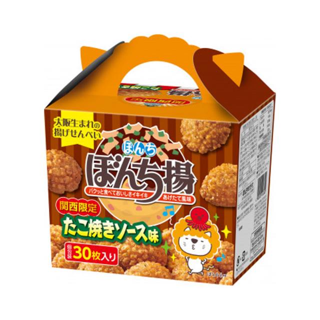 1960年に大阪で生まれた「ぼんち揚」は、薄口しょうゆをベースに鰹と昆布のだしを使用したたれで味付けした、やさしい味わいの揚げせんべいです。カリッとした食感ながら口どけが良く、幅広い層の方からご愛顧いただいているロングセラーブランドです。今回、関西ならではのお土産にぴったりな「ぼんち揚」として、関西名物「たこ焼き」の味わいにアレンジした商品を発売します。鰹の旨みをきかせた特製ソースタレが味の決め手で、ジュワっと口の中に広がるたこ焼きソースの濃厚な味わいをお楽しみいただけます。パッケージは、ぼんちネコとたこ焼きを大きくあしらった、かわいらしいデザインで、持ち運びもしやすい取っ手付きです。お土産として配りやすい個包装タイプです。食べてやみつき、見て楽しい、関西旅行のお土産にぴったりな商品です。内容:30枚入