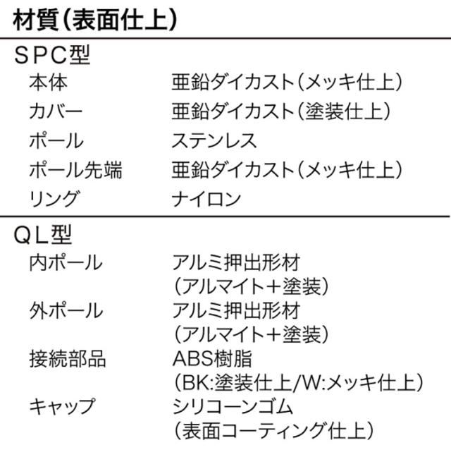 【SPC】本体・カバー・ポール先端:亜鉛ダイカスト/ポール:ステンレス/リング:ナイロン、【QL】内・外ポール:アルミ押出形材 / 接続部品:ABS樹脂 / キャップ:シリコーンゴム