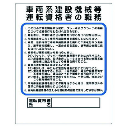 ●表示内容:車両系建設機械等運転資格者の職務●取付仕様:ビス止め、両面テープ止め●縦(mm):500●横(mm):400●厚さ(mm):1