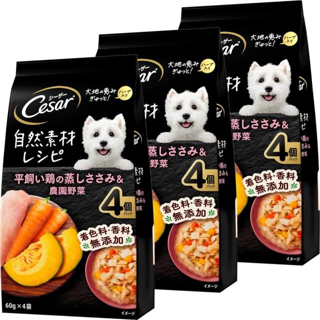 シーザー 自然素材レシピ 平飼い鶏の蒸しささみ&農園野菜 60g×4袋×3個(まとめ買い) ドッグフード 無添加
