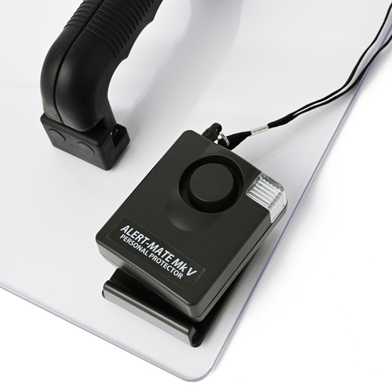 ※写真のアラーム(アラートメイトMK5)はオプション品です。アラートメイトMK5には壁掛けホルダーが付属しています。シールドの好みの位置に取り付けることが可能です。