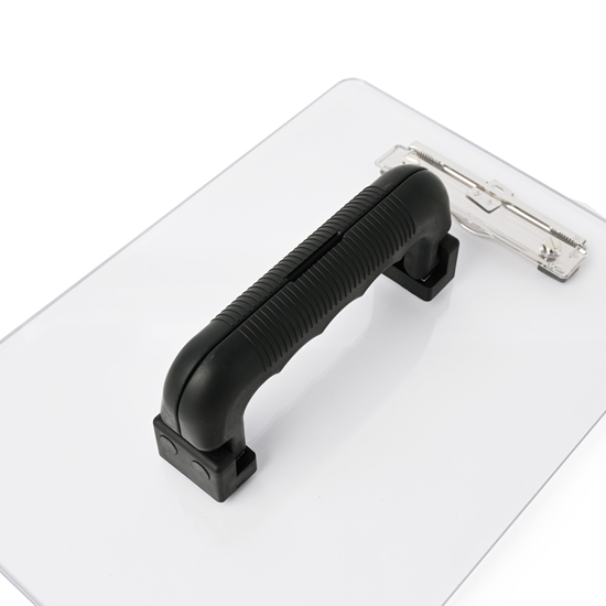 グリップを開いた時の厚さは約30mmと薄くなり、リュックやビジネスバッグに簡単に収納・携帯が可能になります。また車のドアポケットや警官の自転車の後部箱にも収納が可能なサイズとなっています。その他、事務所や店舗の防犯用品としても場所を取らないコンパクトなシールドに仕上げています。