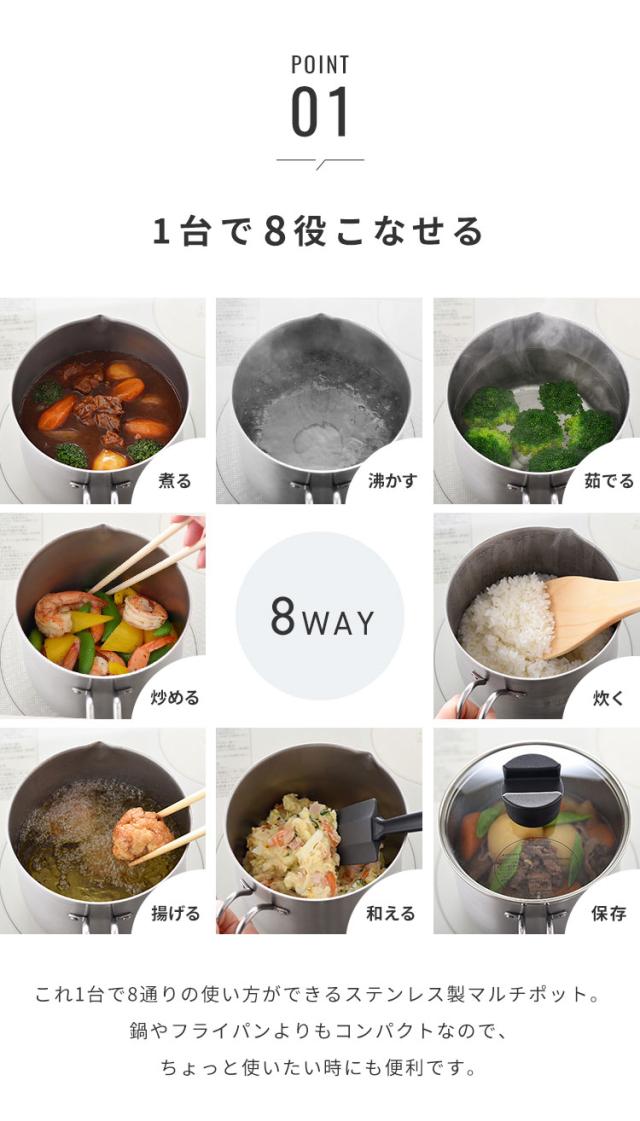 ■深さが有るので和え物も混ぜやすく、揚げ物調理も油が飛び散りにくいです。レトルトパックも立てて温める事ができます。