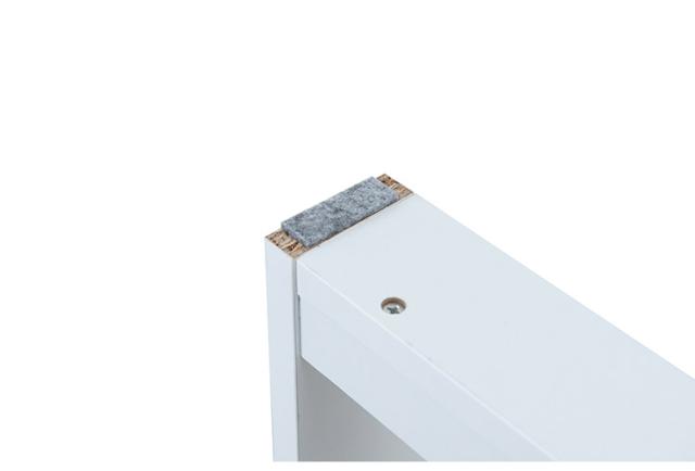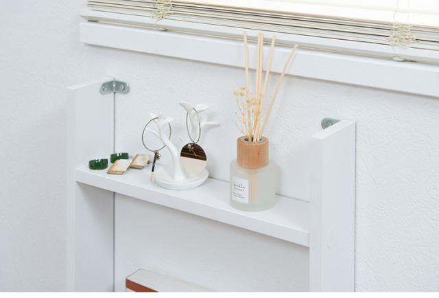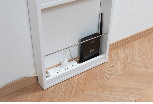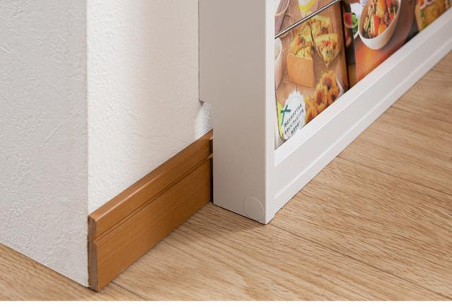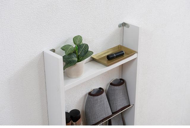 巾木よけ加工をしているので、壁にピッタリ設置ができる超薄型スリッパラック。上段の棚には、芳香剤や観葉植物、鍵などを置くスペースとして。1段にスリッパを3足収納できます。薄型で邪魔にならないのが魅力です。