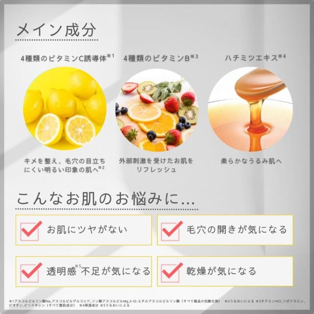 4種類のビタミンC誘導体※1、4種類のビタミンB※2が角層のすみずみまで浸透。毛穴※3や透明感※4不足が気になるお悩み肌にビタミンを補給し、健やかに整えます。※1アスコルビルリン酸Na、アスコルビルグルコシド、リン酸アスコルビルMg、3−O−エチルアスコルビン酸(すべて製品の抗酸化剤)。※2チアミンHCl、リボフラビン、ビオチン、ピリドキシン(すべて整肌成分)。※3キメを整えることにより毛穴を目立たなくする。※4うるおいによる。